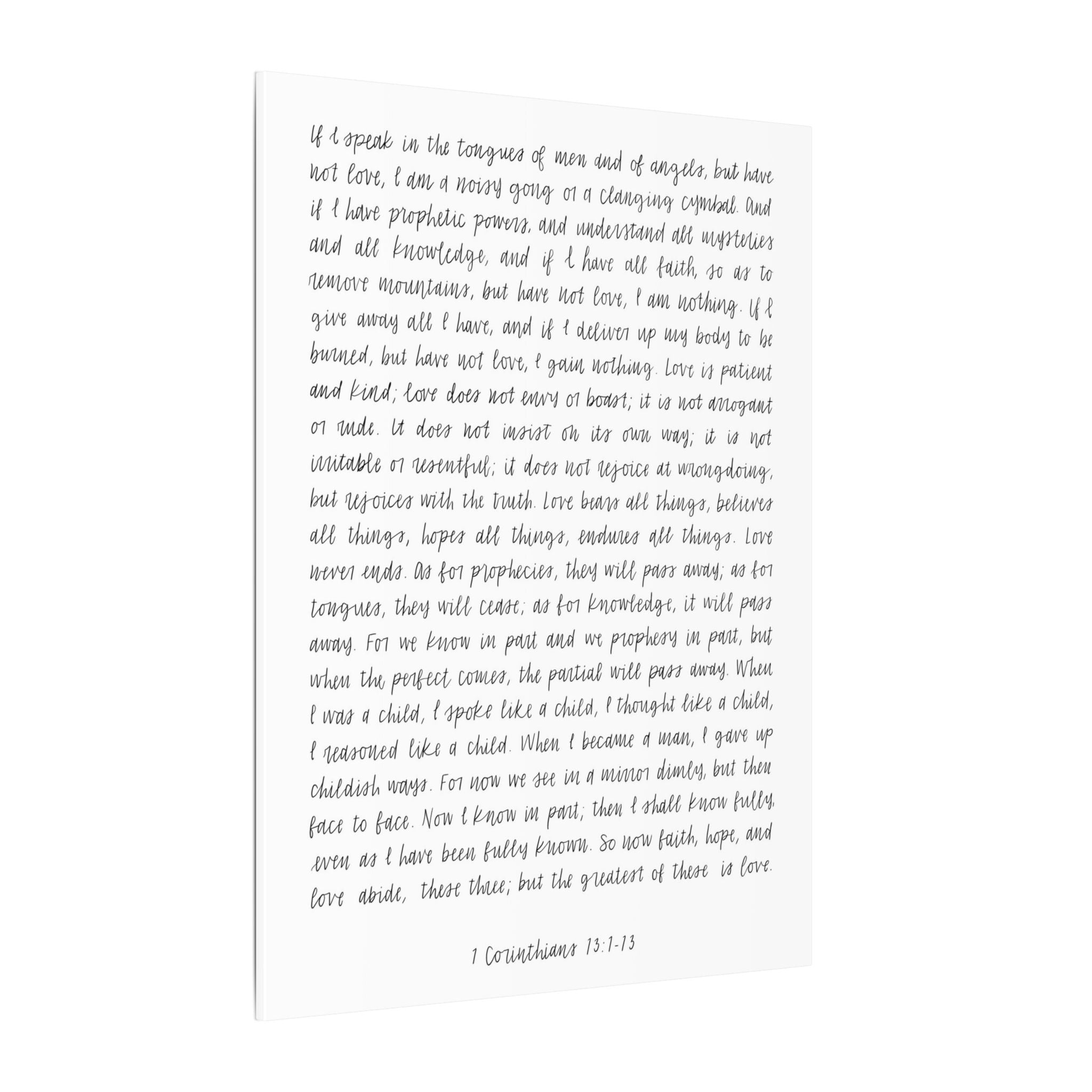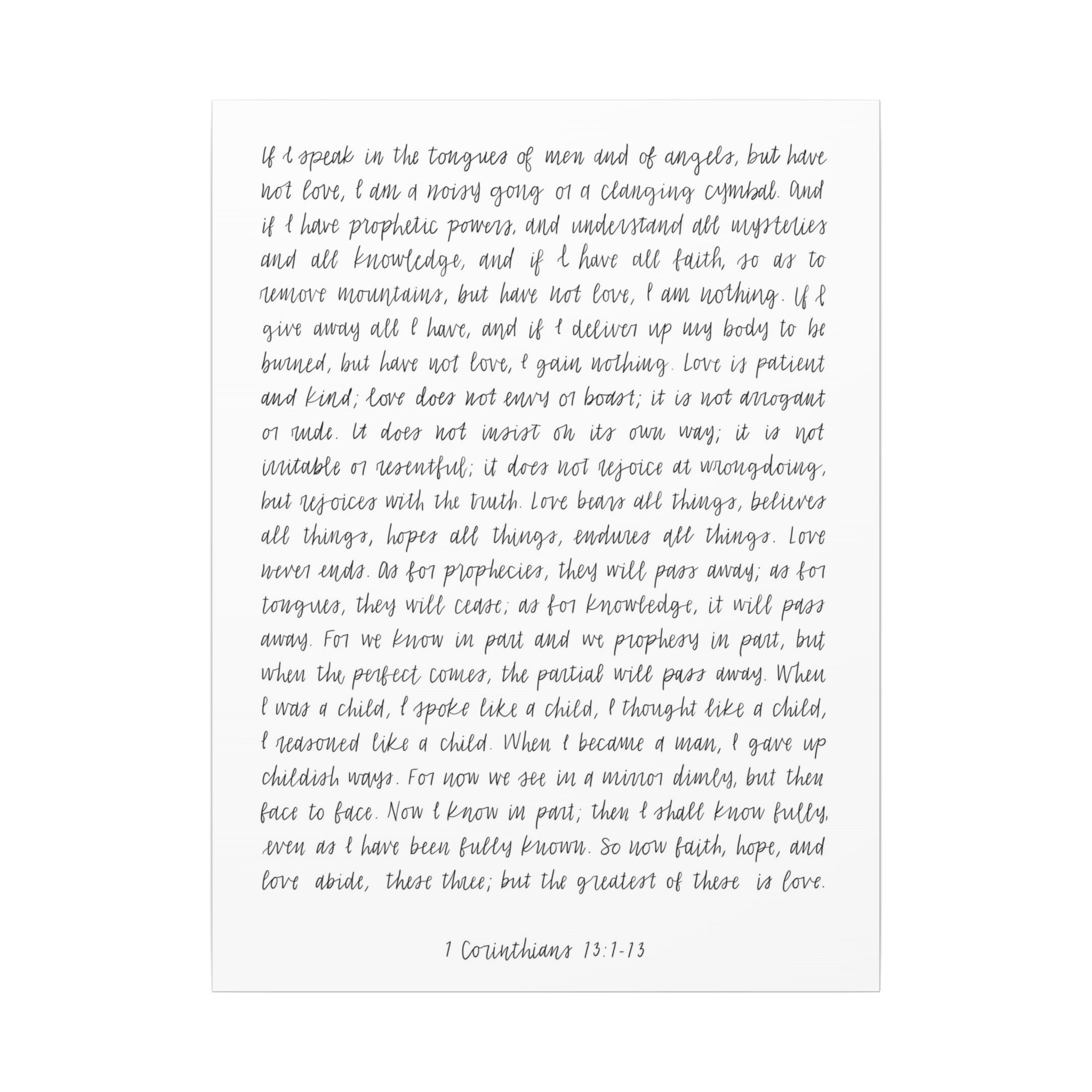 Elevate your space with this minimalist scripture wall art featuring 1 Corinthians 13:1–13 in a graceful handwritten script. Designed to bring calm and beauty to any room, this timeless piece serves as a daily reminder that love is the greatest of all. Its clean, elegant style complements both modern and traditional interiors — perfect for your living room, bedroom, or workspace.